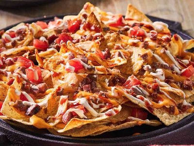 Tortilla chips topped with melted cheese, tomatoes, black olives, lettuce, sauteed peppers & onions